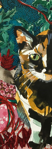 A series of small, lightly narrative works on paper feature a concatenation of cats, plants, gestures, and moments connected by a skein of red. Sneak preview: